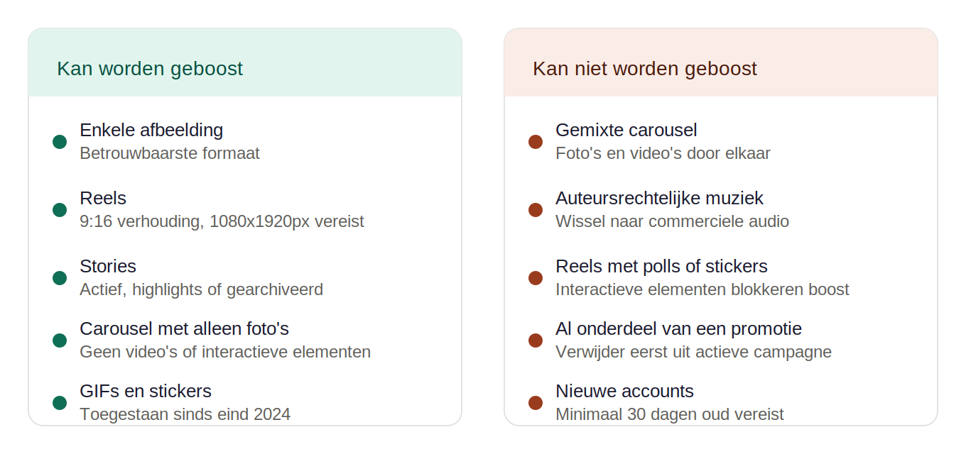 Posts met GIFs en stickers: Instagram heeft eind 2024 de mogelijkheden uitgebreid, waardoor de meeste GIFs en stickers nu wel kunnen worden geboost. Als je hier eerder problemen mee had, is het de moeite waard om het opnieuw te proberen. Muziekrestricties blijven wel van toepassing.