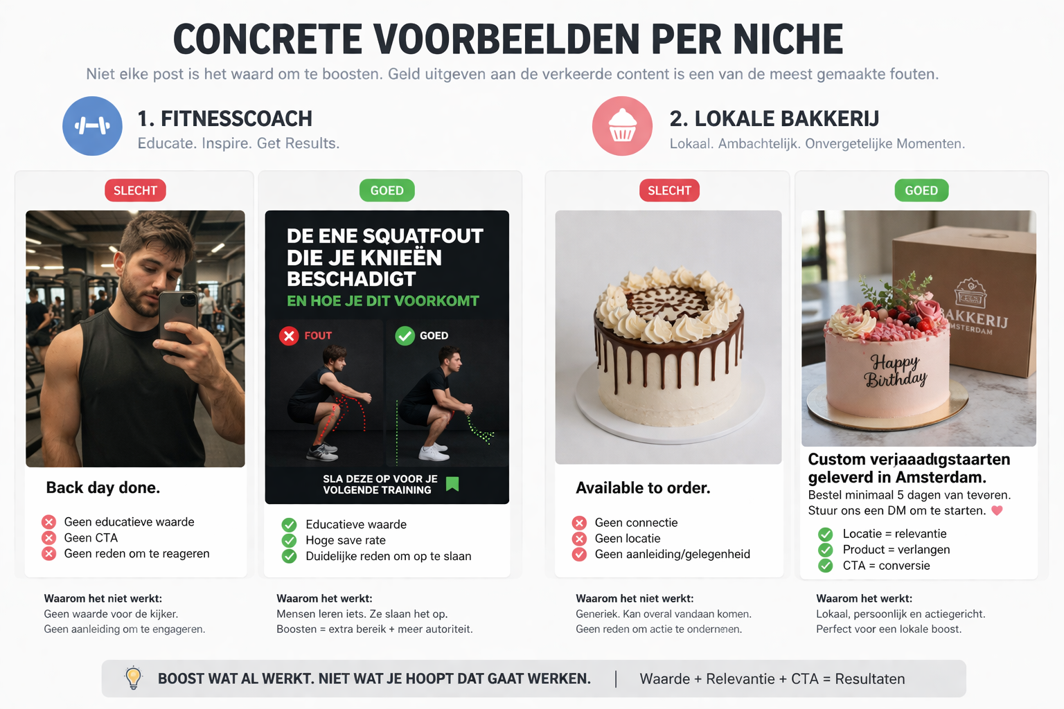 Het slechte voorbeeld hierboven heeft nul saves, één reactie en een engagement rate van 0,2%. De caption is generiek, er zit geen hook in de afbeelding en er is geen reden voor een onbekende om te stoppen met scrollen. Als je deze post boost, besteed je budget aan mensen die geen enkele reden hebben om actie te ondernemen.