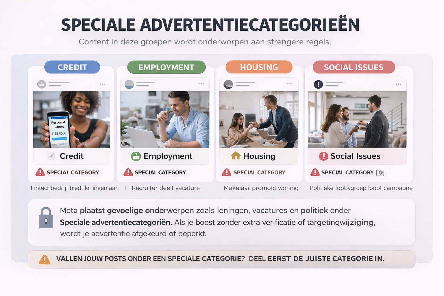 Meta plaatst bepaalde gevoelige onderwerpen onder de zogenaamde Speciale advertentiecategorieën. Als je content binnen een van deze categorieën valt, kun je deze niet op de normale manier boosten. Je moet eerst de juiste categorie selecteren en in sommige gevallen extra verificatiestappen doorlopen.