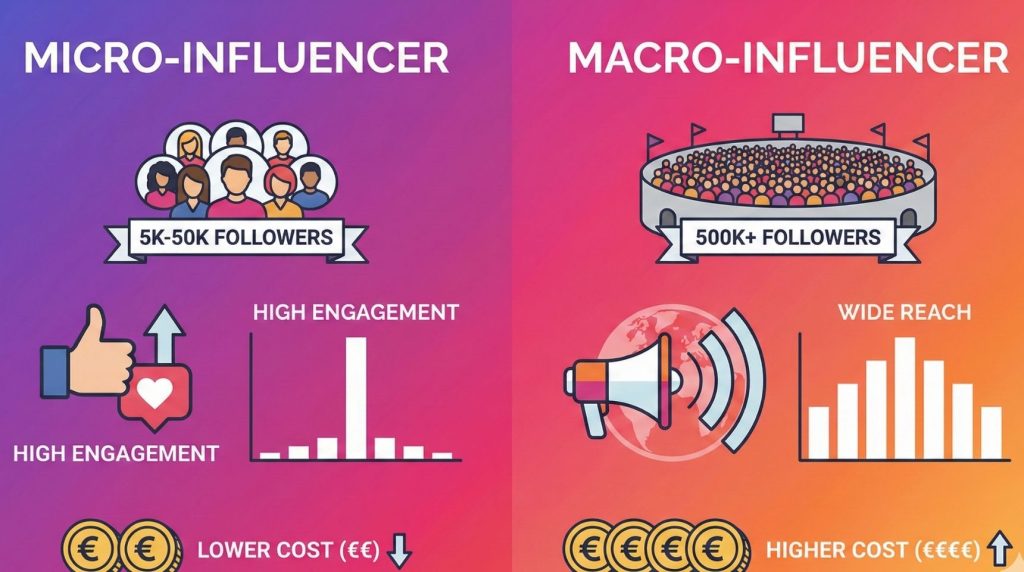 • Macro-influencers: Groot bereik, hogere kosten, algemeen publiek.