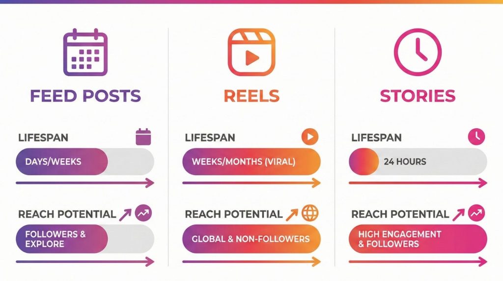 ReelsSnel nieuw publiek aantrekken, viraliteitDagen tot weken (explore feed)Zeer hoog